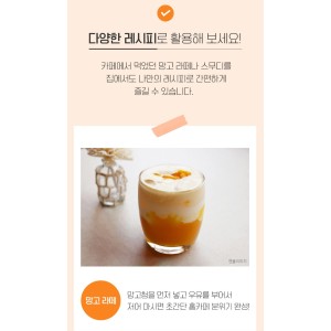 망고청에 시원한 탄산수를 섞어 망고 에이드를 만들거나, 따뜻한 물과 섞어 향긋한 망고티로 즐겨보세요!